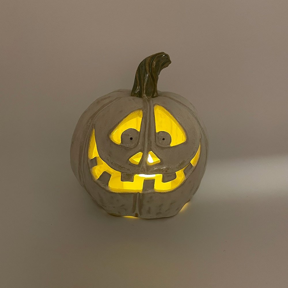 Made from stoneware clay, Wayne the carved ceramic pumpkin is waiting to bring both autumnal sophistication and Halloween humour to your home decor.