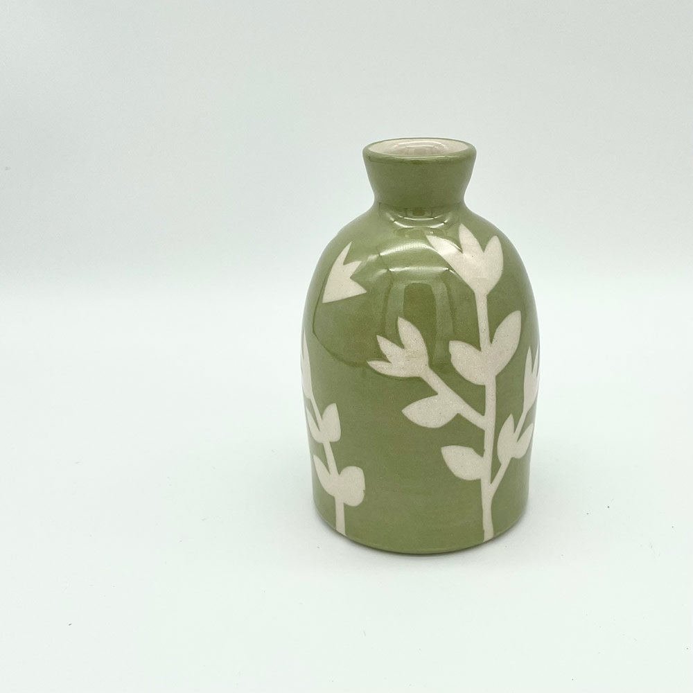 This green, ceramic, bottle shaped bud vase is handmade by me in my garden studio in Derbyshire. I threw it on the potter’s wheel using stoneware clay, then decorated it with a simple leaf stem design inspired by the hedgerows near my home.